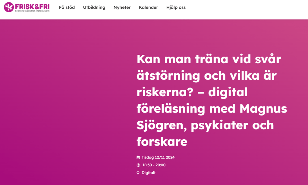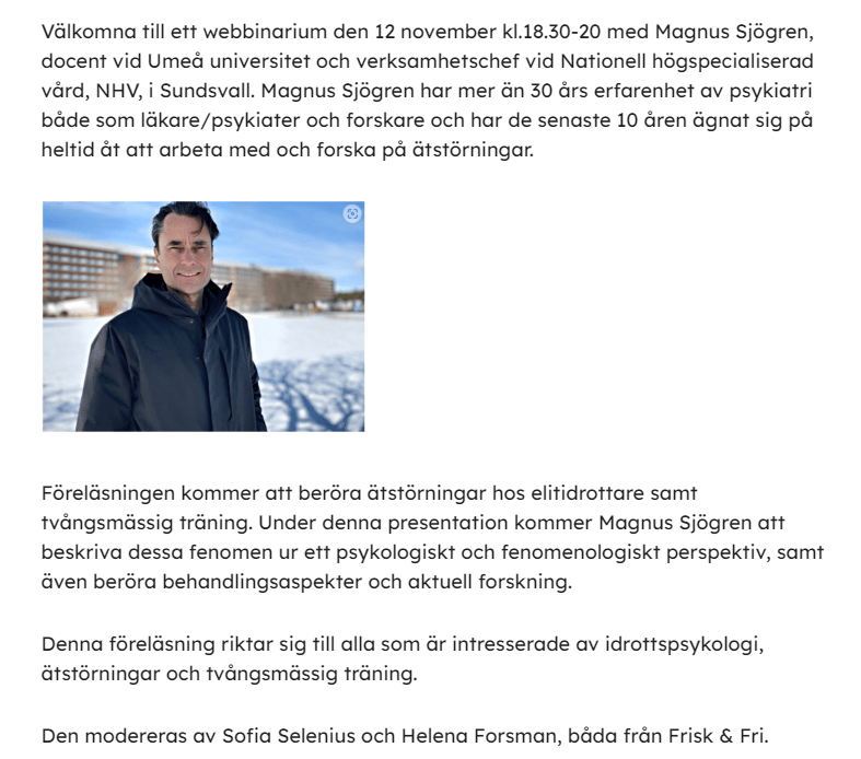 Från Frisk & Fri: https://www.friskfri.se/event/tvangsmassig-traning-oppen-digital-forelasning-med-magnus-sjogren-psykiater-och-forskare/