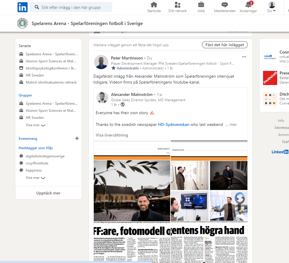 Gå gärna med i Spelarföreningens grupp ”Spelarens Arena” som är enbart för elitfotbollsspelare. Det är en sluten grupp men du som aktiv/tidigare elitspelare är varmt välkommen. Se bilden nedan